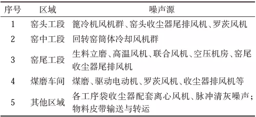 除以上噪聲源,廠區(qū)還存在諸如余熱發(fā)電冷卻塔、物料皮帶輸送、各類袋式收塵器(全廠共計60余臺)等噪聲源,其噪聲特性簡要分析見表2。