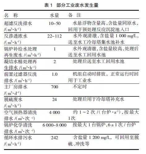 該工程新建2 座2000 m3工業(yè)廢水貯存池作為調(diào)節(jié)水池。同時除脫硫廢水經(jīng)零排放深度處理后,作為冷卻塔補充水、含煤廢水直接回用至輸煤噴淋沖洗系統(tǒng)外,其余工業(yè)廢水,包括主廠房(機組槽)、化水車間、凈水站及廢水區(qū)排放并回收的各種達標工業(yè)廢水,均收集至回用水池,升壓后集中供水至各回用水用水點,包括脫硫系統(tǒng)工藝用水、輸煤系統(tǒng)補給水等用戶。該工程預(yù)計的部分工業(yè)廢水發(fā)生量見表1。