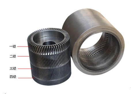研磨型高剪切微乳化機(jī),關(guān)鍵技術(shù)是乳化機(jī)頭的設(shè)計(jì),所述乳化機(jī)頭包括轉(zhuǎn)子和定子,其特征是所述轉(zhuǎn)子沿物料進(jìn)入方向在與定子的接觸面上分別呈一級(jí)槽、二級(jí)槽、三級(jí)槽和四級(jí)槽不同的角度分布,一級(jí)槽的軸向角度α為15--25°,二級(jí)槽的軸向角度β為負(fù)4-負(fù)8°,三級(jí)槽的軸向角度γ為8-14°,四級(jí)槽的軸向角度θ為0-5°;轉(zhuǎn)子和定子沿物料進(jìn)入方向的槽深和槽寬逐級(jí)減小。如圖(1)至(5)所示,其中(1)為電機(jī),(2)為底座,(3)為聯(lián)軸器,(4)為轉(zhuǎn)子,(5)為定子,(6)為進(jìn)料法蘭,(7)為出料法蘭,(8)為一級(jí)槽,(9)為二級(jí)槽,(10)為三級(jí)槽,(11)為四級(jí)槽,(12)為出料工作腔,(13)為軸承座,(14)為Ⅰ級(jí)槽,(15)為Ⅱ級(jí)槽,(16)為Ⅲ級(jí)槽,(17)為Ⅳ級(jí)槽,(18)為軸承,(19)為機(jī)械密封件,(20)為固定螺栓。