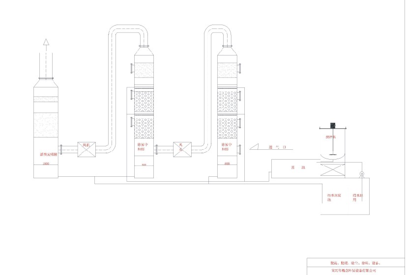 (三)原料罐、溶脹罐采用全封閉設(shè)計(jì),并設(shè)計(jì)安裝連續(xù)式排風(fēng)系統(tǒng),選配具有國(guó)家專利技術(shù)的脫硫、除硝、去味專用設(shè)備(如附流程圖二、原理示意圖三),其中噴霧塔循環(huán)水必須加入橡膠粉專用除味劑,活性炭過(guò)濾塔采用專用的纖維活性炭過(guò)濾器,真正做到環(huán)保、節(jié)能、安全運(yùn)行。