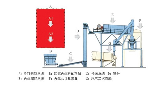 (二)廠辦熱再生就是指廢舊瀝青料經(jīng)破碎分篩后在一種專門(mén)設(shè)計(jì)的加熱筒里加熱、干燥并與強(qiáng)制間歇式瀝青攪拌站配套使用,他主要由回收料供給系統(tǒng)、控制系統(tǒng)、干燥加熱系統(tǒng)、熱回收料儲(chǔ)存計(jì)量系統(tǒng)、除塵系統(tǒng)、控制系統(tǒng)等組成。該設(shè)備工作過(guò)程為:瀝青混合料攪拌設(shè)備運(yùn)行時(shí),回收料供料系統(tǒng)供料、提升機(jī)提料,干燥系統(tǒng)給回收料加熱,加熱后回收料到熱回收料儲(chǔ)存?zhèn)},根據(jù)需要和添加再生料的比例打開(kāi)放料閥,熱回收料進(jìn)入稱量斗計(jì)量并通過(guò)溜道向?yàn)r青攪拌站加料,同時(shí)除塵裝置對(duì)加熱筒尾氣處理,余熱通過(guò)尾氣裝置回收到加熱筒二次加熱,提高熱效率,但此類設(shè)備由于燃燒器直接對(duì)廢舊瀝青料噴射加熱,瀝青混合料容易老化,而且再生料加熱后無(wú)法進(jìn)行二次熱篩,導(dǎo)致級(jí)配無(wú)法控制,因此混合料質(zhì)量、產(chǎn)量包括廢舊料添加量受到一定的限制,目前國(guó)內(nèi)南方路機(jī)、福建鐵拓、國(guó)外馬連尼、日工、安曼等公司都在生產(chǎn)此類設(shè)備。