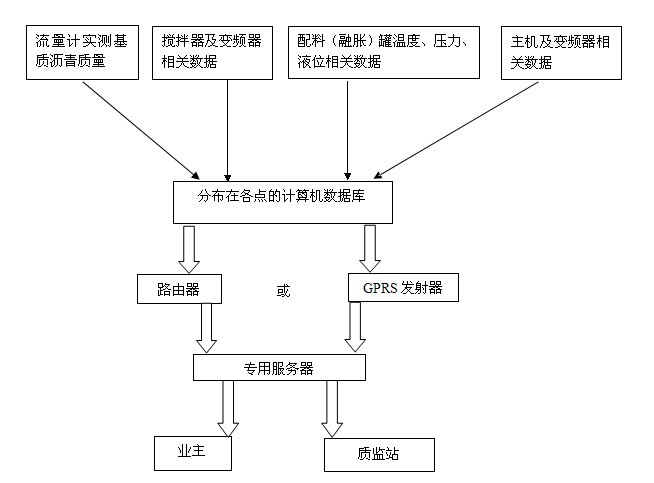 一般來說,改性瀝青生產(chǎn)廠區(qū)內(nèi)的實(shí)驗(yàn)室、控制室和辦公室的距離不超過1000米,利用現(xiàn)有的寬帶網(wǎng)或全向天線和定向天線,可以利用路由器在站內(nèi)實(shí)現(xiàn)的數(shù)據(jù)傳輸;我們將各點(diǎn)的傳感器采集的數(shù)據(jù)存儲到PLC的存儲器中,然后利用WIFI通訊技術(shù),將各點(diǎn)的數(shù)據(jù)實(shí)時傳輸?shù)奖O(jiān)控室內(nèi);用于站內(nèi)的數(shù)據(jù)監(jiān)控,使得管理人員可以對整個改性瀝青生產(chǎn)過程加以監(jiān)督控制,可以及時的從數(shù)據(jù)上發(fā)現(xiàn)改性瀝青生產(chǎn)過程中的質(zhì)量問題。