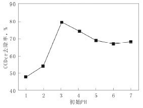 向1000mL腈綸廢水中分別添加H2O2,F(xiàn)eSO437H2O使得廢水中c(H2O2)為39.2mmol/L,c(Fe2+)為14.4mmol/L,控制攪拌速度為150r/min,反應時間為60min,考察初始反應溶液pH對廢水CODCr去除率的影響,試驗結(jié)果如圖1所示。
