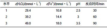 在前面單因素試驗研究的基礎上,進行四因素三水平的正交試驗,正交表見表2,其試驗結(jié)果如表3所示,從表3通過數(shù)據(jù)分析可得出極差大?。篶(H2O2)>pH>反應時間>c(Fe2+),表明Fenton法處理腈綸生化出水時,H2O2的投加量對CODCr去除率影響最大,其次pH值,然后是Fe2+的濃度,最后才是反應時間。