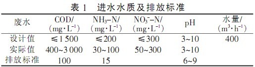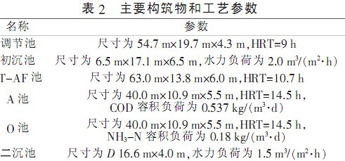 生產(chǎn)廢水首先進(jìn)入調(diào)節(jié)池調(diào)節(jié)水質(zhì)水量然后由提升泵提升至初沉池去除廢水中的SS出水自流進(jìn)3T-AF池在3T-AF池內(nèi)進(jìn)行反硝化以去除廢水中的NO3--NNO2--N和部分COD同時(shí)通過厭氧作用提高廢水的可生化性3T-AF池出水進(jìn)入A/O池進(jìn)一步去除氨氮和有機(jī)物O池的出水部分回流至A池進(jìn)行反硝化脫除總氮并將二沉池的部分污泥回流至A池保持整套A/O系統(tǒng)的污泥濃度在O池中通過硝化菌的作用將氨氮轉(zhuǎn)化成NO3--N和NO2--NO池中的硝化液回流至A池中進(jìn)行反硝化脫氮控制回流比21左右二沉池出水達(dá)標(biāo)排放。主要構(gòu)筑物和參數(shù)見表2。