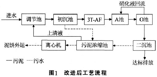3T-AF 中的高效微生物是通過人工篩選馴化復(fù)壯的專用工程復(fù)合菌由多種微生物和復(fù)合酶配置而成對(duì)大分子難降解毒性大的污染物有較強(qiáng)的降解能力和適應(yīng)性 3T-AF 是通過生物活性分子固定化技術(shù)將大量微生物和酶固定在載體上進(jìn)行厭氧反應(yīng) 由此可以提高廢水的可生化性并降解部分有機(jī)物 相對(duì)于水解酸化池 3T-AF 不只進(jìn)行水解酸化反應(yīng) 同時(shí)對(duì)有機(jī)物的降解具有很大的貢獻(xiàn)。改進(jìn)后的工藝流程見圖1。