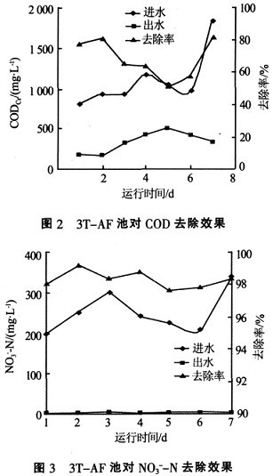 2.1、3T-AF 池的掛膜啟動(dòng)首先在帶有曝氣裝置的微生物培養(yǎng)罐中激活優(yōu)選高效微生物菌種激活周期微生物菌種激活后投加到3T-AF池內(nèi) 用生產(chǎn)廢水進(jìn)行馴化 馴化階段進(jìn)水流量為設(shè)計(jì)流量的1/3。COD 和氨氮負(fù)荷為設(shè)計(jì)值的1/2。馴化15d后進(jìn)水COD平均750mg/l。出水COD平均200mg/l左右。達(dá)到預(yù)期要求 但進(jìn)出水的氨氮含量幾乎沒有什么變化 在這個(gè)時(shí)期AF池的表面出現(xiàn)大量的氣泡 經(jīng)檢測(cè)氣泡主要是由于AF池中的反硝化反應(yīng)形成 池掛膜成功 將生產(chǎn)廢水直接進(jìn)入AF池 并逐步提高進(jìn)水水量至設(shè)計(jì)值 連續(xù)監(jiān)測(cè)AF池進(jìn)出水的特征污染物運(yùn)行效果見圖2、圖3。