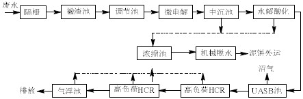生產(chǎn)廢水由管道匯集后通過(guò)機(jī)械格柵由提升泵提升進(jìn)入脫水機(jī)房上的撇渣池,經(jīng)過(guò)隔去浮渣后自流進(jìn)入微電解反應(yīng)池。在微電解池內(nèi),難以降解的多環(huán)芳香類(lèi)大分子物質(zhì)及毒性物質(zhì)被斷裂開(kāi)環(huán)、去除和減少,廢水可降解性大大提高,鹽度降低,而且提高了廢水的可生化性,為下一步生化系統(tǒng)提供良好的條件;微電解出水進(jìn)入沉淀池進(jìn)一步泥水分離,然后再進(jìn)入升流式厭氧污泥床(UASB)反應(yīng)池,利用厭氧菌去除大部分有機(jī)物,同時(shí)維持廢水的可生化[3];經(jīng)過(guò)預(yù)處理及厭氧處理后,廢水依次進(jìn)入一級(jí)、二級(jí)高壓射流反應(yīng)器(HCR),通過(guò)好氧高速代謝,完成對(duì)有機(jī)物的大量去除;最后的低濃度廢水進(jìn)入氣浮池,經(jīng)氣浮池再次去除SS、色度后,達(dá)標(biāo)外排。系統(tǒng)產(chǎn)生的污泥通過(guò)板框壓濾機(jī)處理后,泥餅外運(yùn)處置。