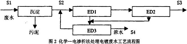 化學法和電滲析聯(lián)合使用,組成如圖2的工藝流程,不但節(jié)約藥劑、減少污泥量,而且化學法處理后的上清液經(jīng)電滲析處理后,淡水可以達到回用標準,實現(xiàn)電鍍廢水的閉路循環(huán),既不污染環(huán)境,又充分利用了水資源。