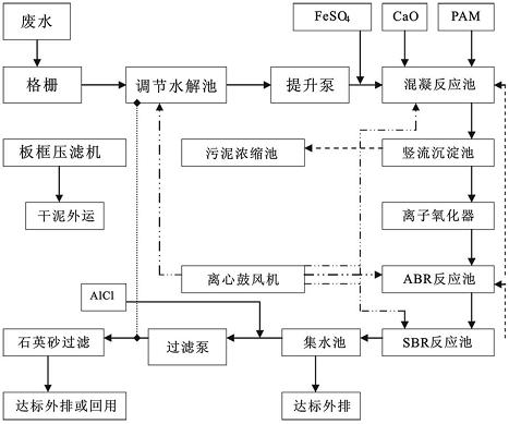 本項目采用水解酸化+混凝沉淀+離子氧化+ABR+SBR的組合處理工藝,工藝流程如下: