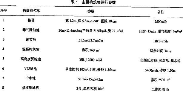 從經濟投資和占地面積比較,生化一物化處理術要比物化處理技術高,并且生化的運行管理難度較大。河南省安陽市西區(qū)綜合污水處理廠中水設施于2006年12月開始正式運行,主工藝采用法國德利滿公司先進性的高密度沉淀池加v形濾池技術。平均處理量為120000 m3/d(5000m3/h).中水處理工藝流程見圖3。中水處理的主要構筑物及設備運行參數(shù)見表1。