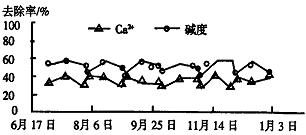 從圖7分析,硬度(以Ca2+硬度計)和總堿度的去除率分別為40%、52%:處理后的水質明顯得到改善。硬度去除反應原理為: