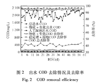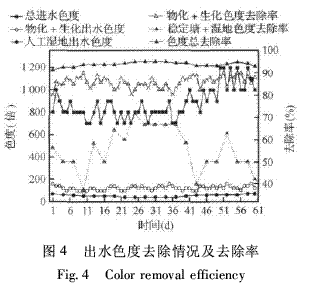 常規(guī)物化+生化組合和植物穩(wěn)定塘-人工濕地系統(tǒng)區(qū)段進(jìn)出水色度及色度去除效果如圖4所示,系統(tǒng)總進(jìn)水色度為650~1 200倍,平均877倍。跟SS一樣,前40天色度波動(dòng)較小,在650~900倍之間,平均807倍;第40天后,進(jìn)水色度范圍為800~1200倍,波動(dòng)較大,極差達(dá)400倍,是最低值的1/2,進(jìn)水平均值1 033倍。經(jīng)物化+生化組合前40天出水色度平均120倍,后20天平均130倍,出水色度平均為123倍,平均去除率約86.0%;經(jīng)植物穩(wěn)定塘-人工濕地系統(tǒng)深度處理后,出水波動(dòng)較少,出水平均值為50倍左右,去除率為55.6%;整個(gè)系統(tǒng)工藝平均總?cè)コ蔬_(dá)93.8%。植物穩(wěn)定塘-人工濕地系統(tǒng)對(duì)色度深度去除效果明顯,色度值降低了一半以上。由于印染廢水中含有難生化降解的PVC、化學(xué)助劑等,常規(guī)物化+生化組合不能將其中復(fù)雜分子結(jié)構(gòu)的顯色集團(tuán)徹底破壞,導(dǎo)致出水色度值較高。增加了植物穩(wěn)定塘-人工濕地系統(tǒng)后,易被吸附降解的色度得到去除,但殘余物質(zhì)的顯色使得出水色度時(shí)有略超過50倍,只達(dá)到基本排放標(biāo)準(zhǔn),故此工藝仍有改進(jìn)的空間。
