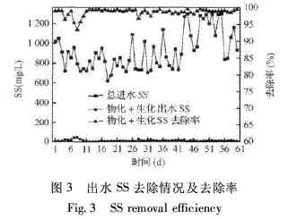 系統(tǒng)穩(wěn)定運(yùn)行后的進(jìn)水SS和去除效果如圖3所示,進(jìn)水SS波動(dòng)曲線上下浮動(dòng)顯著。其中,前40天進(jìn)水SS主要在617~1 140 mg/L波動(dòng),極差513mg/L,平均830 mg/L;后40天進(jìn)水SS波動(dòng)更為明顯,浮動(dòng)在727~1 300 mg/L,極差達(dá)573 mg/L,平均1 120 mg/L;前后兩階段平均值極差已達(dá)290 mg/L。這主要跟紡織企業(yè)的運(yùn)行情況相關(guān),因?yàn)楣に囘\(yùn)行階段紡織出口受國(guó)際經(jīng)濟(jì)形勢(shì)影響,訂單來源不穩(wěn)定,導(dǎo)致污水排放的水質(zhì)水量變化顯著。盡管如此,經(jīng)過常規(guī)物化+生化組合工藝處理后,出水SS保持穩(wěn)定,10 mg/L左右,遠(yuǎn)低于GB8978-1996一級(jí)標(biāo)準(zhǔn)70 mg/L,平均去除率達(dá)到98.6%。經(jīng)植物穩(wěn)定塘-人工濕地系統(tǒng)進(jìn)一步過濾、吸附處理后,出水SS小于5 mg/L。