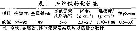 海綿鐵外觀灰黑色有亮點(diǎn),呈疏松海綿狀,是由鐵、炭及其他雜質(zhì)(Mn,Cr,Ni,CaO,MgO等)組成的合金,其物化性能如表1所示。