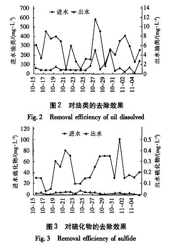 該污水處理廠自2003年6月運(yùn)行以來,經(jīng)過前期的調(diào)試和運(yùn)行經(jīng)驗(yàn)的積累,現(xiàn)在的運(yùn)行情況良好,對各類污染物的處理效果見圖2—6。由圖可以看出,進(jìn)水水質(zhì)變化非常劇烈,水質(zhì)也較差。對于出水水質(zhì),大連石化分公司在實(shí)際運(yùn)行中執(zhí)行《污水綜合排放標(biāo)準(zhǔn)》(GB8978--1996)與遼寧省地方標(biāo)準(zhǔn)《遼寧省沿海地區(qū)污水直接排人海域標(biāo)準(zhǔn)》(DB21-59-89),要求必須達(dá)到其中的二級標(biāo)準(zhǔn),力爭達(dá)到一級標(biāo)準(zhǔn),具體指標(biāo)如表2所示。從實(shí)際運(yùn)行結(jié)果來看,出水完全能夠達(dá)到一級排放標(biāo)準(zhǔn),同時(shí)也達(dá)到了設(shè)計(jì)指標(biāo),但是從出水監(jiān)測的數(shù)值來看,出水中的油含量有兩次未達(dá)到一級排放標(biāo)準(zhǔn),而達(dá)到3.5mg/L,分析原因?yàn)镈CI除油裝置和DFA氣浮裝置在此期間運(yùn)行不太正常所致。