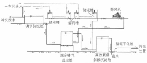 由于攀鋼鈦白粉廠一車間為兩層建筑,進水口在二層,出水口在一層,可以利用車間現(xiàn)狀,使廢水及污泥在各處理構(gòu)筑物之間靠重力自流,利用自然高差進行流水線處理。因此本工程將兩個溶藥槽、兩個儲液槽以及計量泵、鼓風機和調(diào)節(jié)初沉池設(shè)置在車間二層;車間一層則設(shè)置混合曝氣反應池、高效絮凝斜板沉淀池和污泥干化池。