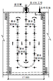 水解酸化單元由原Ⅰ、Ⅱ系列的勻質(zhì)池改造而成,增加了中沉池與污泥回流系統(tǒng);為防止污泥沉淀,在每格水解酸化池內(nèi)增加4 臺(tái)潛水推流攪拌器,其具體位置及水流方向見(jiàn)圖2。改造后的水解酸化池分4 格,每格尺寸為32.0 m× 16.0 m × 5.7m,有效水深為5.0 m,有效容積為2 560 m3。污水從池的頂部配水槽進(jìn)入,由出水側(cè)頂部溢流排出進(jìn)入中沉池。新增中沉池2 座,直徑為15.0 m,采用懸掛式中心傳動(dòng)刮泥機(jī);回流污泥采用氣提,回流比為100%;剩余污泥被污泥泵提升至污泥濃縮池。在水解酸化池和中沉池設(shè)置廢氣收集裝置[6]。