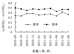 水解酸化池進(jìn)、出水m(BOD5)/m(CODCr)值的變化趨勢(shì)見(jiàn)圖3。