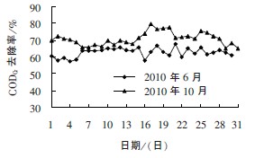 水解酸化池自2010 年8 月投入運(yùn)行后,對(duì)于提高后續(xù)好氧生化處理效果明顯?,F(xiàn)根據(jù)2010 年6 月和2010 年10 月的檢測(cè)數(shù)據(jù),分析了水解酸化池投用前、后對(duì)純氧曝氣池、后續(xù)生化處理單元(純氧曝氣池進(jìn)水至三沉池出水)去除CODCr的影響,詳見(jiàn)圖5、圖6。