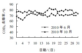 水解酸化池穩(wěn)定運(yùn)行期間進(jìn)、出水CODCr濃度見(jiàn)圖4。