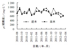 圖7 水解酸化池進(jìn)、出水硫酸鹽濃度的變化情況