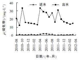 水解酸化池壁上或沉積于池底的污泥中存在硫酸鹽還原菌。水解酸化池進(jìn)水中的硫酸根濃度較高,主要來(lái)自烯烴濕式氧化廢堿液及外來(lái)污水。污水中的硫酸根離子在厭氧時(shí)被硫酸鹽還原菌還原成硫離子,硫離子易轉(zhuǎn)化成有毒的硫化氫。這種游離的氣體排入大氣中將產(chǎn)生惡臭。水解酸化池進(jìn)、出水中硫酸鹽和硫化物濃度的變化情況見(jiàn)圖7 、圖8。