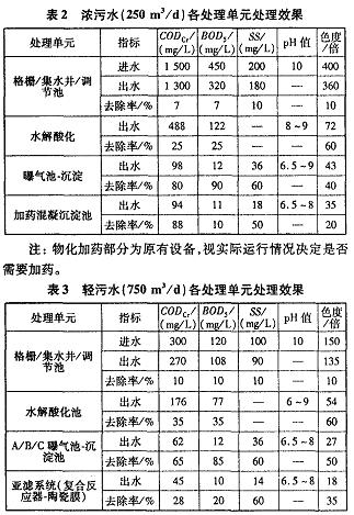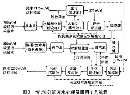 輕污染水(約占75%)一水解氧化一好氧一復合反應器一陶瓷膜一回用濃污染水(約占25%)一水解調(diào)節(jié)池一混凝池一酸化水解池一接觸氧化池一生物濾池一脫色池一排放工藝流程如圖3所示。