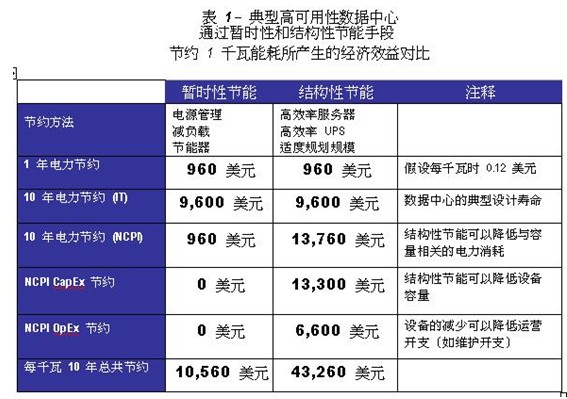 需要了解的一條關(guān)鍵原理是,通過(guò)降低能源消耗可以降低與功率容量相關(guān)的成本以及能源成本。也就是說(shuō),如果一種實(shí)施方法在許多情況下可以節(jié)約電能,則它也能夠減少NCPI基礎(chǔ)設(shè)施成本(主要由負(fù)載功率需求引發(fā))。需要了解的另一條相關(guān)的關(guān)鍵原理是,暫時(shí)性降低能源消耗與永久性降低能源消耗是不同的。暫時(shí)性節(jié)約(例如減負(fù)載或服務(wù)器電源管理)可以降低電力成本,但未必降低NCPI系統(tǒng)的額定功率和相關(guān)的NCPI基礎(chǔ)設(shè)施成本。永久性或結(jié)構(gòu)性更改(如高效率服務(wù)或高效率UPS系統(tǒng))可同時(shí)降低電力成本和基礎(chǔ)設(shè)施成本。表1中闡釋了這些原理并給出了節(jié)約價(jià)值的示例。
