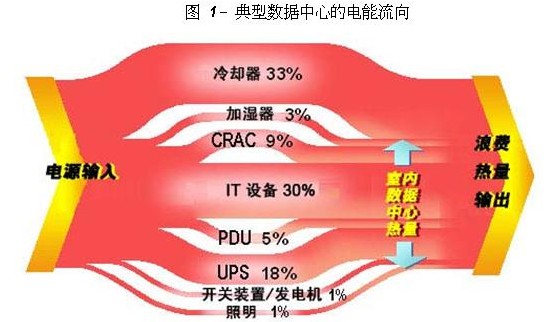 數(shù)據(jù)中心使用的能源只有大約一半甚至不足一半消耗在IT負(fù)載上。另一半消耗在包括電源設(shè)備、冷卻設(shè)備和照明設(shè)施在內(nèi)的網(wǎng)絡(luò)關(guān)鍵物理基礎(chǔ)設(shè)施(NCPI)設(shè)備上。圖1顯示了典型高可用性數(shù)據(jù)中心中電能的流向。需要注意的是,數(shù)據(jù)中心消耗的所有能源最終都會(huì)以廢熱的形式排放到室外大氣中。圖1是根據(jù)采用2N電源設(shè)備和N+1冷卻設(shè)備、在大約30%的額定容量下工作的典型數(shù)據(jù)中心。