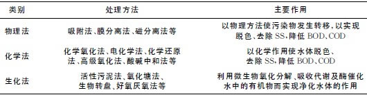 這類廢水具有顏色深、毒性大、COD 及BOD 值較高、組成復(fù)雜多變、排放量大、分布面廣、難降解等特點(diǎn),若不經(jīng)處理直接排放,將會給生態(tài)環(huán)境帶來嚴(yán)重危害。近年來,國內(nèi)外對于染料廢水的處理研究十分活躍,根據(jù)處理方法不同可大致分為3類(表1)。
