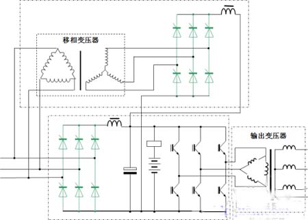 有0.8左右,換言之器輸入諧波電流達(dá)30%以上。這個數(shù)值標(biāo)志著破壞了電網(wǎng)電壓的正弦波波形,對外干擾大和增加了無功功率對線路的占空比,限制了供電局對外輸出的有效功率。因此供電局一般都對用戶提出了輸入功率因數(shù)必須大于0.9的要求,否則就罰款。如果增加整流脈沖的個數(shù)就可提高輸入功率因數(shù)。因此就出現(xiàn)了12脈沖整流器輸入的UPS.如圖3所示。這種電路的結(jié)構(gòu)特點就是在原有電路的基礎(chǔ)上再加一套6脈沖整流器,另外再加一個移相變壓器。這樣做了以后可將輸入功率因數(shù)提高到0.9,如果再加11次諧波濾波器,又可將輸入功率因數(shù)提高到0.95以上。這樣做的代價有多大呢?某典型300kVA的UPS在6脈沖整流器時是1600kg,變成12脈沖整流器后重量是2200kg,增加了600kg.400kVA的UPS變成12脈沖整流器后則加了650kg!而某品牌300kVA的UPS才重830kg!相差何其懸殊!