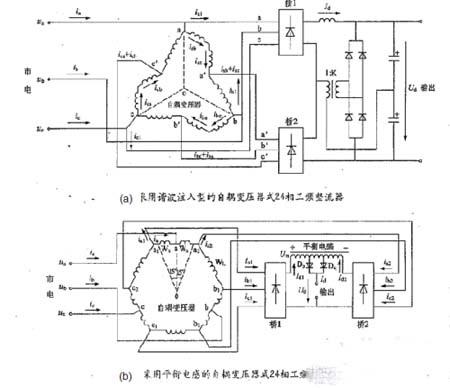 為了將輸入功率因數(shù)進(jìn)一步提高,有的專家提出了24相整流方案,整流脈沖可達(dá)24個之多,輸入功率因數(shù)可達(dá)0.99以上。圖4(a)和(b)分別為采用諧波諸如型的自耦變壓