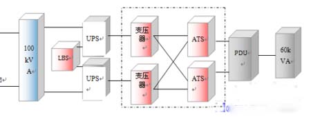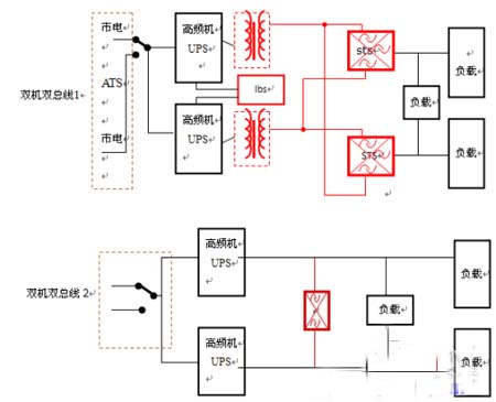 尤其是有的用戶認(rèn)為可靠性是用錢堆起來的,認(rèn)為設(shè)備越多可靠性越高。實際上設(shè)備越多增加的串聯(lián)環(huán)節(jié)就越多,相應(yīng)地可靠性也越低!如圖9所示就是高頻機型UPS供電臃腫系統(tǒng)的一個例子,說它臃腫是因為這本來是一個很節(jié)能的供電系統(tǒng),兩臺高頻機型UPS冗余并聯(lián)后給負(fù)載供電,簡單明了。可單單設(shè)計者又給UPS后面串聯(lián)了大功率變壓器,又串入了兩臺大容量STS,致使效率至少損失了4%~5%,不但投資增加很多,占地面積也大為增加。為什么會這樣規(guī)劃呢?原因是設(shè)計者機械地理解了美國的G4標(biāo)準(zhǔn),認(rèn)為只有做成所謂的雙總線,系統(tǒng)才可靠,這就陷入了用過多設(shè)備堆積可靠性的誤區(qū)。實際上圖9的每一路供電路徑上多了兩個故障點:變壓器和STS.可靠性下降了數(shù)倍。世界上十全十美的東西太少了,就是說,增加了這方面的功能卻犧牲了另一方面的功能,這就是有得有失的道理。