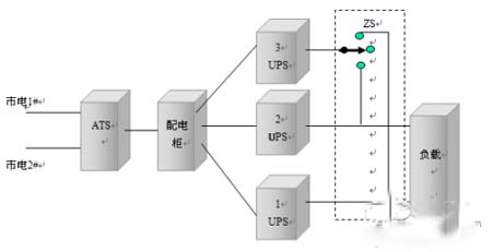當(dāng)然,多臺UPS冗余并聯(lián)雖是提高了可靠性,但也帶來了負(fù)面影響,那就是使系統(tǒng)效率降低了,因為原來兩臺工作時各為50%負(fù)載,當(dāng)3臺工作時,每臺的帶載量才僅有三分之一。為此可采用圖1 1的改良式1+2節(jié)能供電方式。在這里高頻機3UPS在正常時處在轉(zhuǎn)換開關(guān)ZS的中間空檔位置,其他兩臺UPS按50%方式供電,處于效率最高點。任一臺UPS故障,3UPS就接通到故障設(shè)備的一方。提高了可靠性也提高了運行效率。