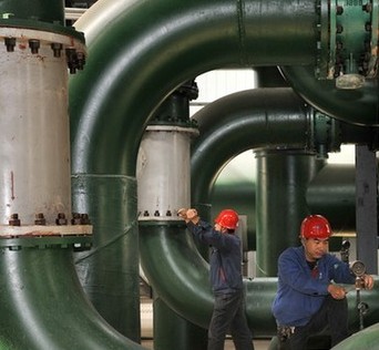 這是國內(nèi)目前最大的工業(yè)余熱利用供熱項目,其設(shè)計供熱能力為2115萬平方米,采用熱泵等先進(jìn)技術(shù),通過收集工業(yè)循環(huán)水中的廢熱,解決石家莊市高新區(qū)南部居民采暖問題。該項目今年新增供熱能力1000萬平方米。(記者 趙威攝)