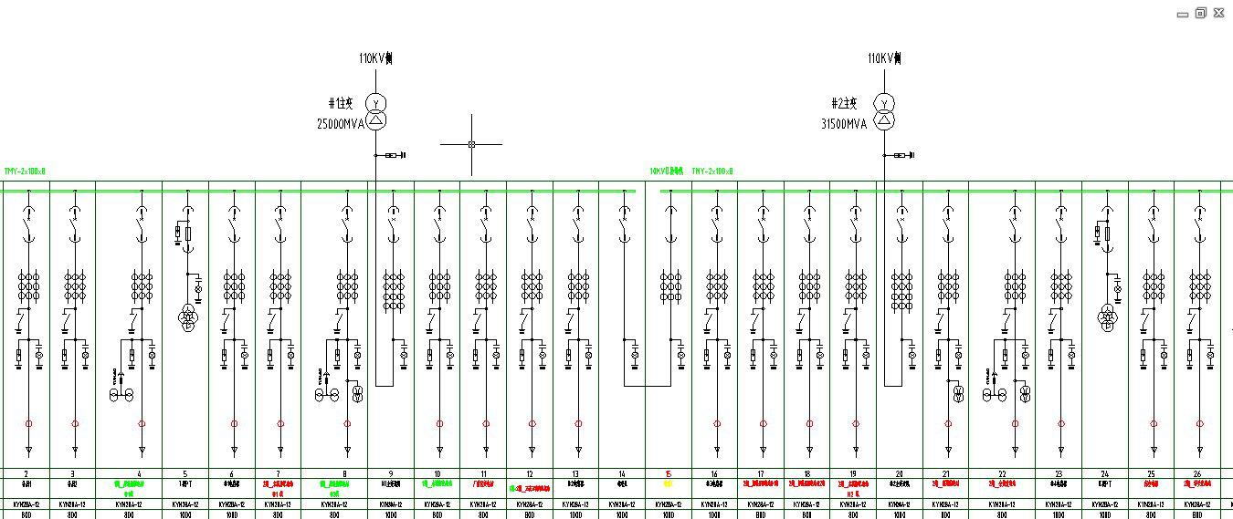 中材萍鄉(xiāng)水泥4500t/d新線的供電由福田鎮(zhèn)供電局引兩路110kV供電線路至新線總降變電所,通過25000MVA的1#主變和31500MVA的2#主變降壓至10kV并配出到廠區(qū)窯頭、窯尾、原料磨、水泥磨、石灰石破碎等各個生產(chǎn)線配電室。試運行階段新生產(chǎn)線由老廠區(qū)供電,如今生產(chǎn)線投產(chǎn),供電線路正常運作,1#主變未投,靠2#主變?yōu)檎麠l新線的生產(chǎn)供電。