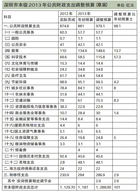 昨日,深圳市五屆人大常委會第二十五次會議審議了《關(guān)于深圳市2013年本級預(yù)算調(diào)整方案的報告》、《關(guān)于全口徑預(yù)決算審查監(jiān)督工作情況的報告》等。據(jù)悉,2013年公共財政支出將調(diào)增預(yù)算101億元,加大教育、交通等民生領(lǐng)域的投入,其中教育調(diào)增13.7億,污水處理調(diào)增6億。