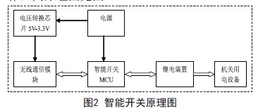 對于智能開關(guān)而言,其主要負(fù)責(zé)對即時電價控制或遠(yuǎn)程控制命令進(jìn)行接收和解析,并以此為依據(jù)對機(jī)關(guān)單位的用電設(shè)備進(jìn)行開關(guān)等操作,其原理圖見圖2。