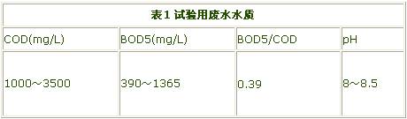試驗用廢水采用某化工廠排出的綜合廢水,該廢水含有季銨鹽、異丙醇等有機物,日排放量約為20 m3,COD為18 000~25 000 mg/L,BOD5為7 020~9 750 mg/L,BOD5/COD為0.39左右,屬于可生化真溶液廢水。由于該廢水有機物濃度高,將其適當(dāng)稀釋后作為試驗用水,其水質(zhì)見表1。