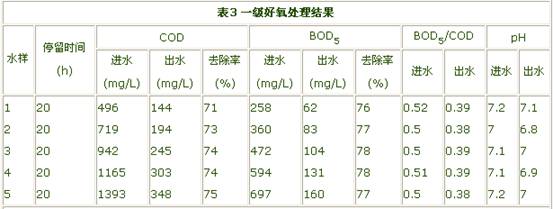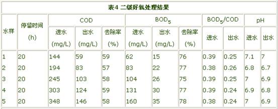 好氧接觸氧化法處理銨鹽廢水處理,具有耐沖擊負荷,無污泥膨脹和維護方便等優(yōu)點。采用一級好氧生物接觸氧化處理,出水中的COD仍然達不到排放標(biāo)準(zhǔn),后又增加了一級好氧生物接觸氧化處理(有效容積20 L)。試驗結(jié)果見表3和表4。