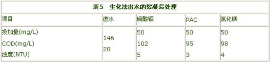 含季銨鹽廢水中COD為2 000~3 000 mg/L,經(jīng)過厭氧→兩級好氧生物接觸氧化處理后,出水COD>100 mg/L,且略有余濁,故進行絮凝后處理。分別采用硫酸鋁、聚合鋁(PAC)和氯化鎂為絮凝劑,石灰為助凝劑,試驗結(jié)果見表5。
