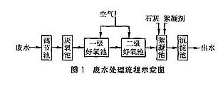 根據(jù)試驗結(jié)果及分析,采用厭氧→兩級好氧→絮凝組合工藝可以有效地處理難降解的含季銨鹽廢水,使廢水中COD總?cè)コ蔬_96%以上,出水COD<100 mg/L。含季銨鹽廢水處理工藝如圖1。