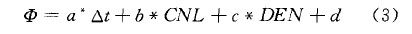 具體計算方法為:建立孔隙度( )與測井曲線值聲波時差△ 、中子CNL、密度DEN 的一個關(guān)系式如下(據(jù)中石化內(nèi)部文獻(xiàn)):