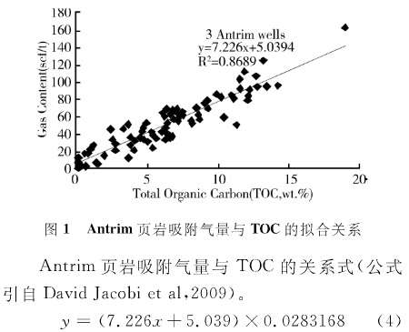 依據(jù)不同TOC含量,測得的吸附氣量,可以擬合本地區(qū)的吸附氣量與有機(jī)碳含量TOC的關(guān)系,進(jìn)行類推。這里提供國外的吸附氣量與TOC關(guān)系(圖1),供參考。
