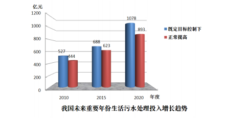 “十一五”后的十年,用于城鎮(zhèn)生活污水處理的投入保持持續(xù)增長(zhǎng),未來重要年份增長(zhǎng)情況如下圖: