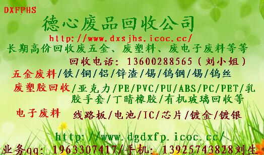東莞市長(zhǎng)安德心廢品回收公司是東莞市一家證件齊全、規(guī)模較大、資金雄厚,有強(qiáng)大的處理加工能力的回收企業(yè)。公司本著“公平公正、誠(chéng)實(shí)守信、互惠互利、薄利多銷”價(jià)高同行、致力環(huán)保事業(yè)”為宗旨的經(jīng)營(yíng)理念。以最合理的價(jià)格與各企事業(yè)單位合作,最終達(dá)到“變廢為寶、保護(hù)環(huán)境、共創(chuàng)效益”是我公司的服務(wù)理念!