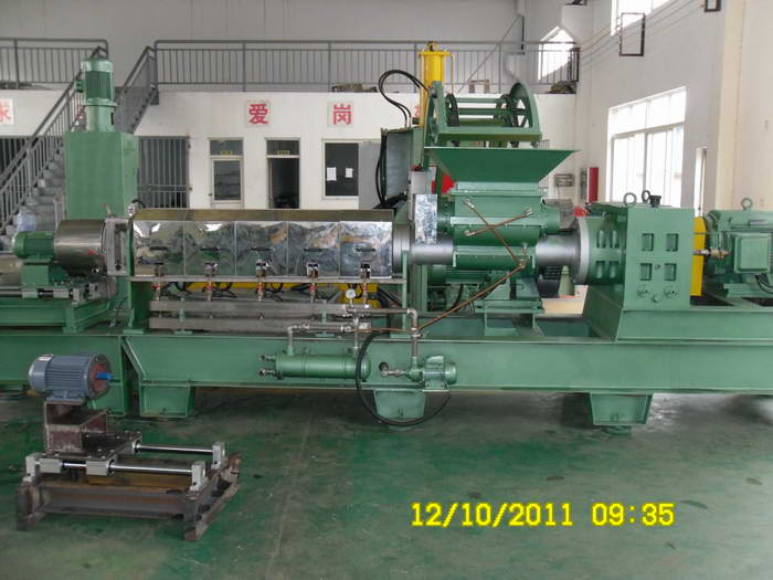 4、喂料機構采用螺旋槳雙挽式,吃料能力強。特別適用于直接經(jīng)密煉機混煉的團狀物料擠出造料。
